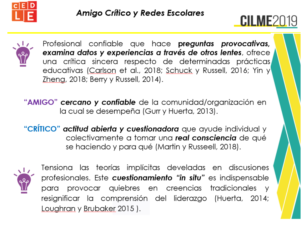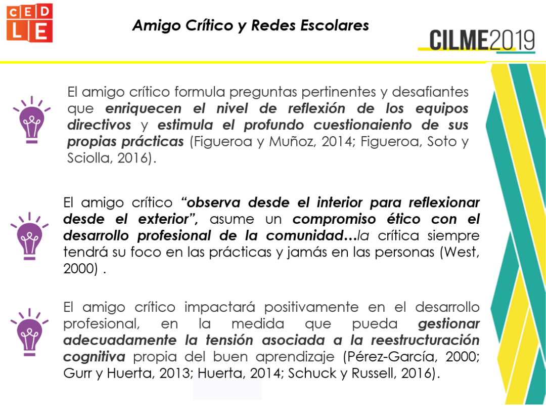 En atención a esta necesidad, el proyecto CEDLE “Transformación de Redes de Mejoramiento Escolar en Comunidades Profesionales de Aprendizaje”, durante los años 2016-2017 diseña un modelo de acompañamiento a las redes de mejoramiento escolar, el cual considera la participación de un nuevo actor educativo denominado “Amigo/a Crítico/a”.
